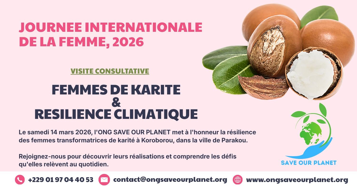 À l’occasion de la Journée internationale de la femme, l’ONG Save Our Planet célèbre la résilience exceptionnelle des transformatrices de karité de Koroborou, dans la ville de Parakou. Le samedi 14 mars 2026, une visite consultative unique sera organisée à leur rencontre pour découvrir leurs réalisations et échanger sur les défis quotidiens qu’elles relèvent face aux enjeux climatiques. Cette initiative vise à soutenir celles qui, par leur travail acharné, œuvrent chaque jour pour un avenir durable au Bénin.