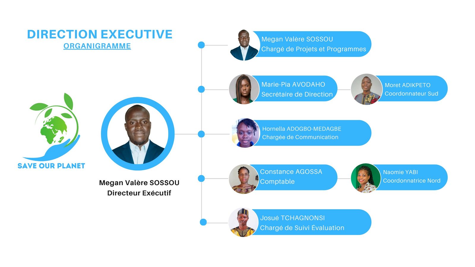 La Direction Exécutive et les coordinations régionales incarnent sur le terrain l’impulsion donnée par le Conseil. Constituées majoritairement de jeunes professionnel(le)s et de femmes dynamiques, elles mettent en œuvre les projets avec des compétences pratiques en gestion de projet, sensibilisation communautaire, ingénierie environnementale et soutien psychosocial. Leur force réside dans leur polyvalence et leur proximité avec les bénéficiaires, transformant les stratégies en actions concrètes qui améliorent directement la santé des populations, la résilience des écosystèmes et l’autonomie des femmes.